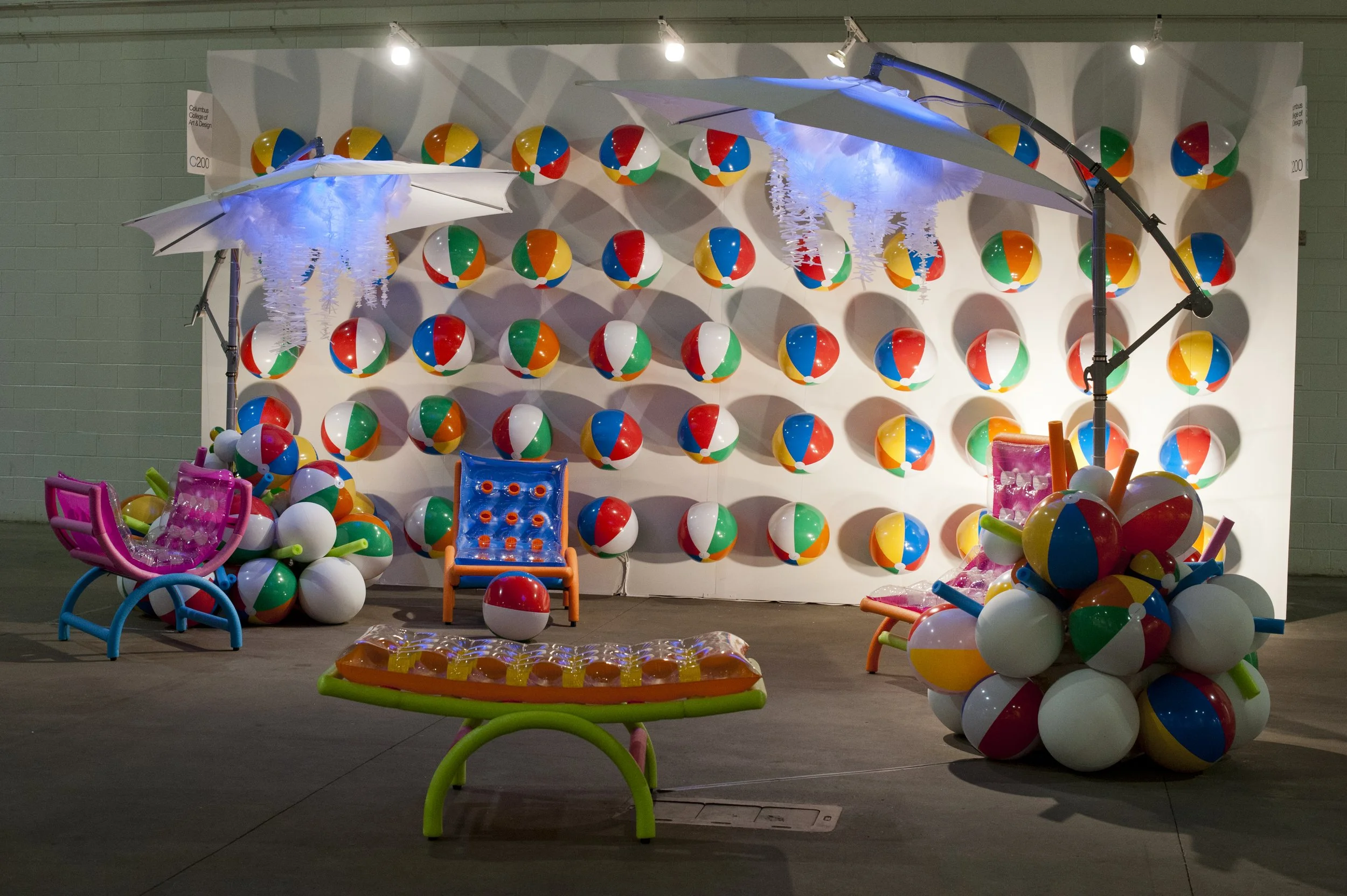 Chairs are fabricated using steel tubing covered in pool noodles and inflated rafts. we also created a dome like structure utilizing umbrellas and beach themed items, as well as projection and sound that further emphasize the idea of the beach. By creating a sensory seating environment that utilizes both light and sound, our exhibit blurs the line between high and low art, allowing SOFA guests to reflect and ponder a new environment while considering their own impact on the environment.