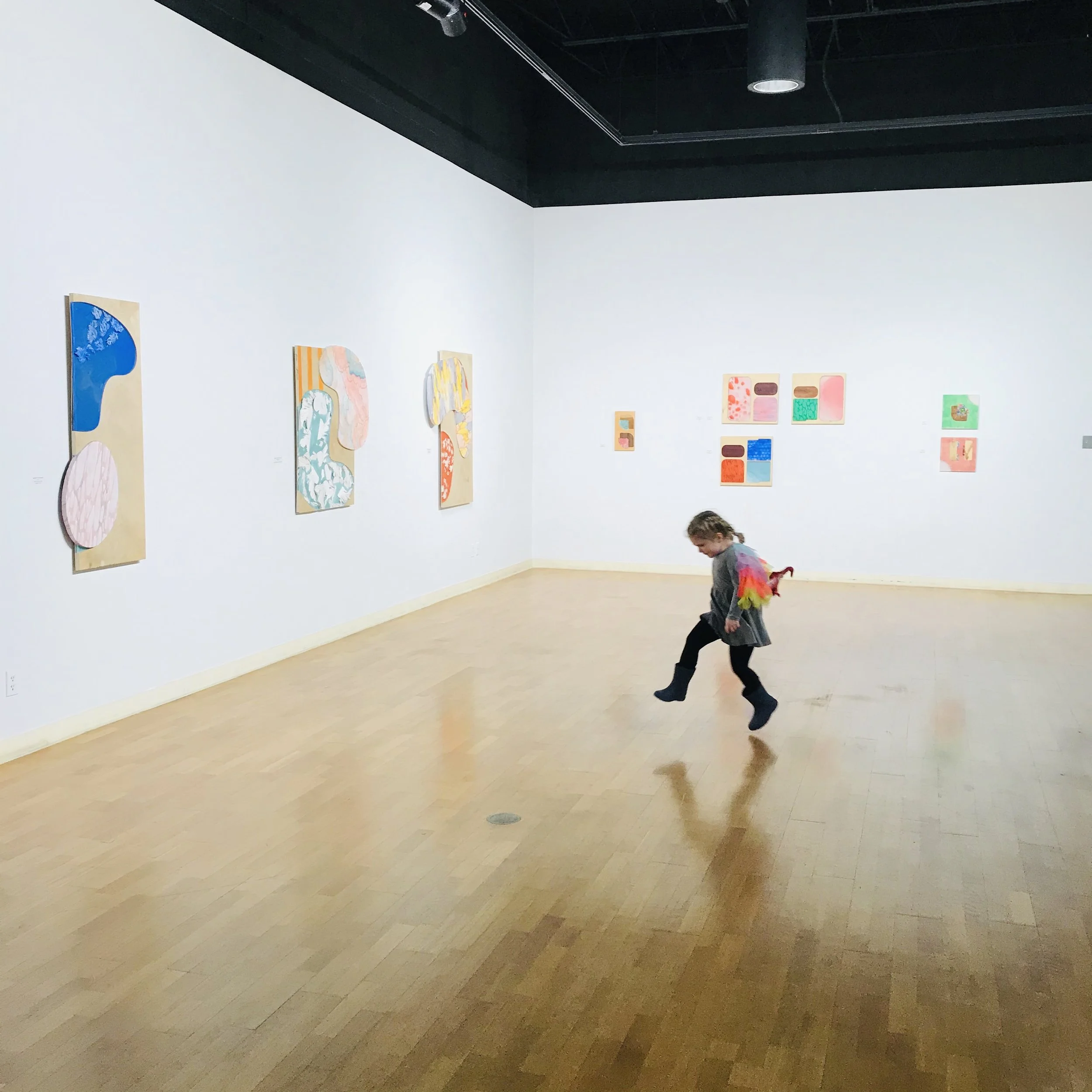 In January of 2020, we were featured in an exhibition at Illinois Wesleyan University. We traveled 6 hours in winter storms with our 12 month old daughter to install the show. We were welcomed to the space by Carmen Lozar, a curator, gallery director, artist, and mother. Carmen and the gallery interns helped us layout and install artwork over the next 24 hours before we did a marathon drive home. In March of 2020, one week before COVID-19 pandemic stay at home orders were issued, we returned (with both our children) to de-install and take the work back home. The photos featured here are of the melding that occurs as an artist parent, folding children into the activities that you must accomplish. We believe that you can see the influence of that inclusion in our artwork.