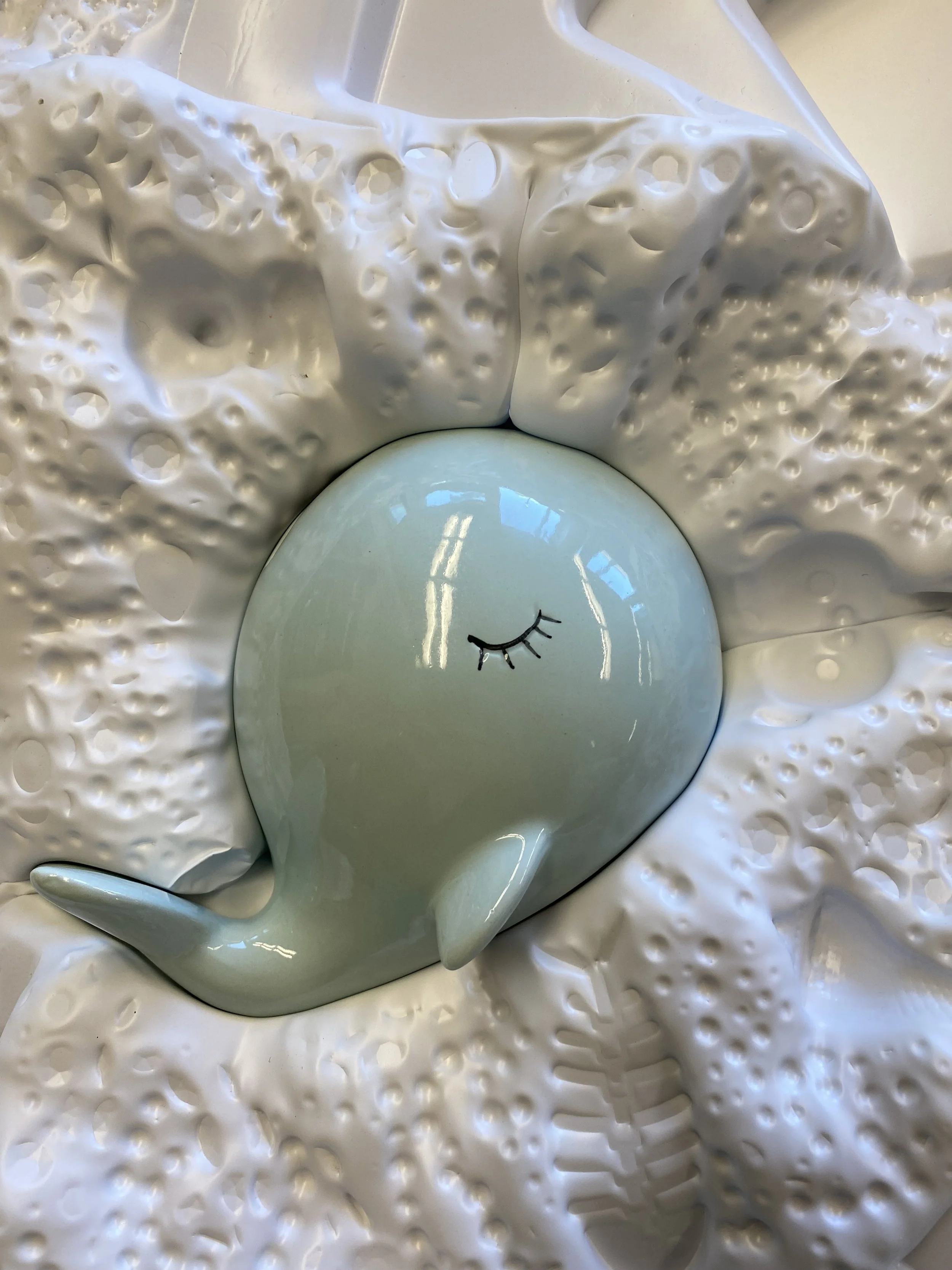 Found object stuck in vacuum formed polystyrene before we removed it. The plastic cradles the child’s piggy bank in a pillowing manner. Work in progress image. 2021